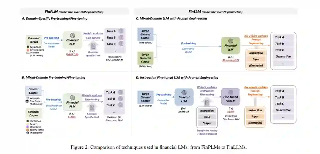 大型语言模型(LLMs)在各种自然语言处理(NLP)任务中展现了显著的能力,并吸引了包括金融服务在内的多个领域的关注。尽管对通用领域LLMs的研究广泛,且它们在金融领域具有巨大的潜力,但金融LLM(FinLLM)的研究仍然有限。本综述提供了FinLLMs的全面概览,包括它们的历史、技术、性能以及机遇和挑战。首先,我们通过对通用领域预训练语言模型(PLMs)的时间顺序概览,到当前的FinLLMs,包括GPT系列、选定的开源LLMs和金融LMs。其次,我们比较了财务PLMs和FinLLMs中使用的五种技术,包括训练方法、训练数据和微调方法。第三,我们总结了六个基准任务和数据集的性能评估。此外,我们提供了八个高级金融NLP任务和数据集,以开发更复杂的FinLLMs。最后,我们讨论了FinLLMs面临的机会和挑战,如幻觉、隐私和效率。为了支持金融领域的AI研究,我们在GitHub上编译了一系列可访问的数据集和评估基准。