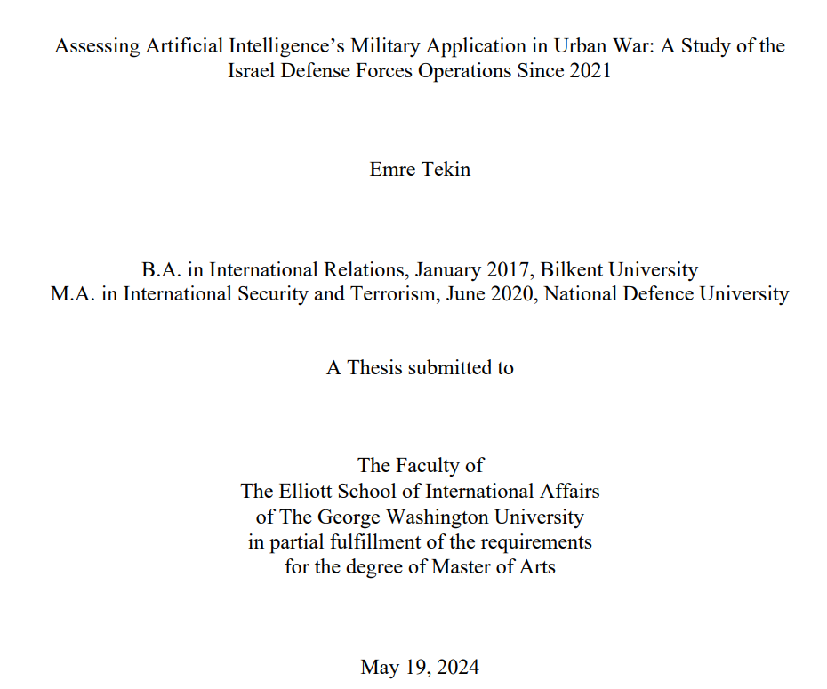 本论文研究了人工智能在城市军事行动中的整合,特别关注以色列国防军在城市战争中对人工智能技术的应用。研究首先定义了城市环境,为探测城市环境在战争中的特殊性奠定了基础,讨论了关于人工智能变革战争潜力的理论观点,然后通过考察以色列国防军自 2021 年以来的行动,进入人工智能在城市作战中的实际应用。通过分析人工智能在城市作战中的应用,该报告试图了解人工智能在城市作战中的作用及其塑造未来城市战争态势的潜力。