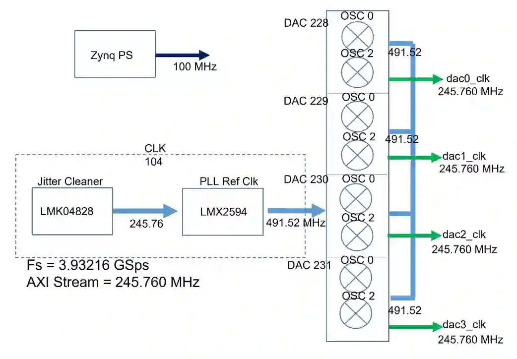 图 4 ARWG 时钟配置,包括 ZCU208 CLK104 外设、RFDC 采样时钟和 AXI 流时钟