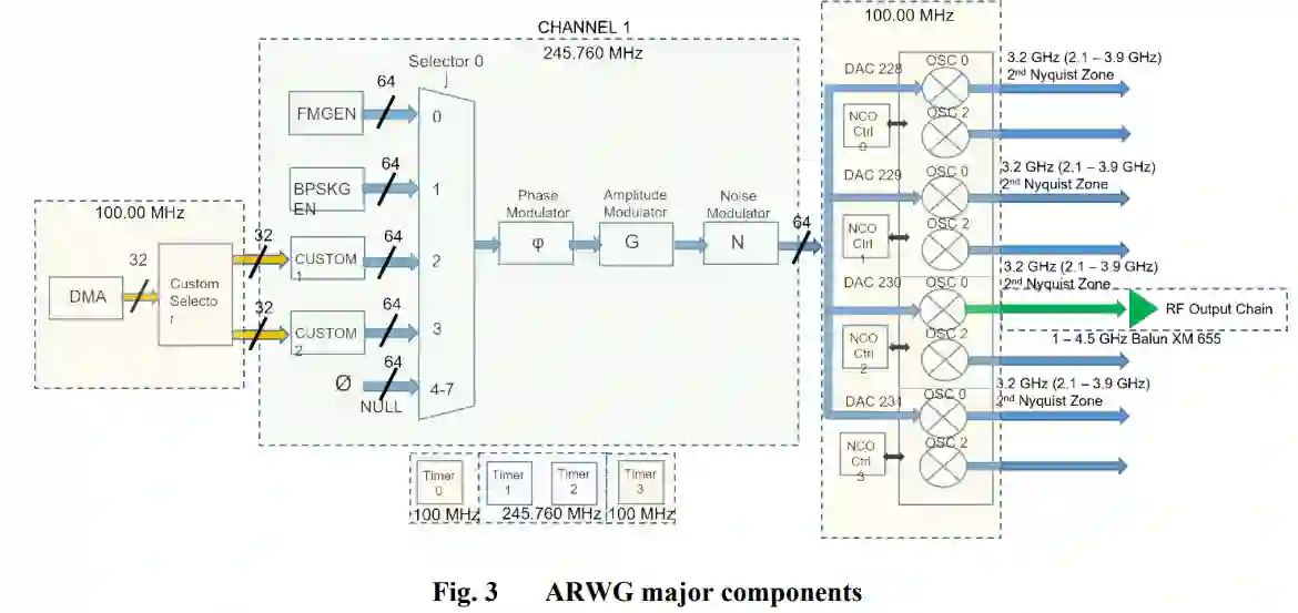 本文介绍先进雷达波形发生器(ARWG)。ARWG 是软件定义电子战系统系列的一部分。它是在商用 AMD-Xilinx Gen3 射频片上系统中以 ZCU208 评估板的形式实现的。它提供了一个灵活的平台,用于生成用户定义的雷达脉冲,具有脉冲内调制、近乎实时的自定义波形生成、脉冲到脉冲频率灵活性、用户定义的幅度、频率和相位调制以及复合脉冲群生成等复杂功能。它包括多个用户界面,包括串行命令行界面和基于 Python 的图形用户界面。ARWG 通过千兆以太网接口与支持的个人电脑 (PC) 相连,因此可以与驻留在 PC 中或跨网络的强大应用程序进行交互。本文讨论了 ARWG 的基本设计和主要功能,并展示了示例功能。