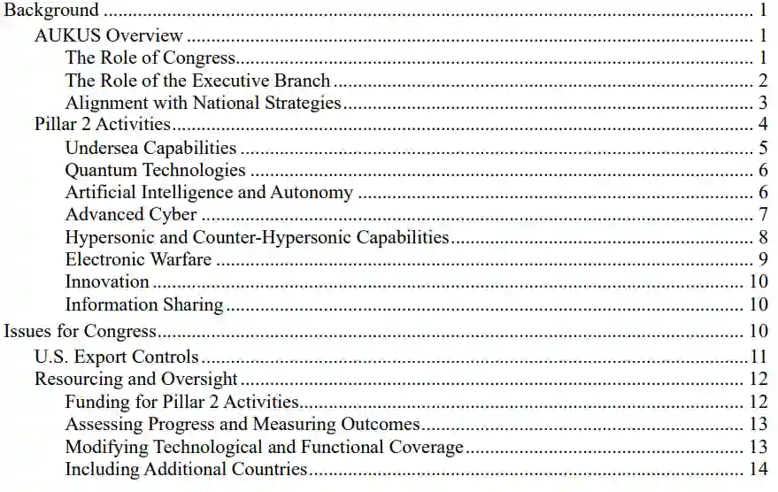 这些工作组的活动与每个参与国政府更广泛的地区和全球防务战略密切相关,并引起了一些国会议员和其他利益相关者的极大关注。本报告介绍了 AUKUS 第二支柱的起源、作用和实施情况,并确定和分析了供国会审议的潜在问题。美国会可能面临的具体问题包括