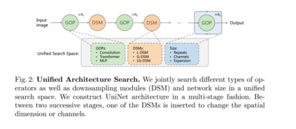 近年来,transformer和多层感知器(MLP)架构在各种视觉任务中取得了令人印象深刻的成果。然而,如何有效地将这些运算符组合在一起,形成高性能的混合视觉架构仍然是一个挑战。在这项工作中,我们通过提出一种新的统一架构搜索方法来研究卷积、transformer和MLP的可学习组合。我们的方法包含两个关键设计来实现对高性能网络的搜索。首先,我们以统一的形式对不同的可搜索运算符进行建模,从而使这些运算符可以用相同的一组配置参数来表征。这样,整体搜索空间的大小大大降低,总搜索成本变得可以承受。其次,我们提出了上下文感知下采样模块(DSMs),以减轻不同类型操作之间的差距。我们提出的DSM能够更好地适应不同类型运算符的特征,这对于识别高性能混合架构非常重要。最后,我们将可配置算子和DSM集成到一个统一的搜索空间中,并使用基于强化学习的搜索算法进行搜索,以充分探索这些算子的最优组合。为此,我们搜索了一个基线网络,并将其扩大,得到了一个名为UniNets的模型家族,它比以前的ConvNets和transformer取得了更好的精度和效率。特别地,我们的UniNet-B5在ImageNet上实现了84.9%的top-1准确率,比efficient - net - b7和BoTNet-T7分别减少了44%和55%的失败。通过在ImageNet-21K上进行预训练,我们的UniNet-B6达到87.4%,性能优于Swin-L,失败次数减少51%,参数减少41%。代码可以在https://github.com/Sense-X/UniNet上找到。