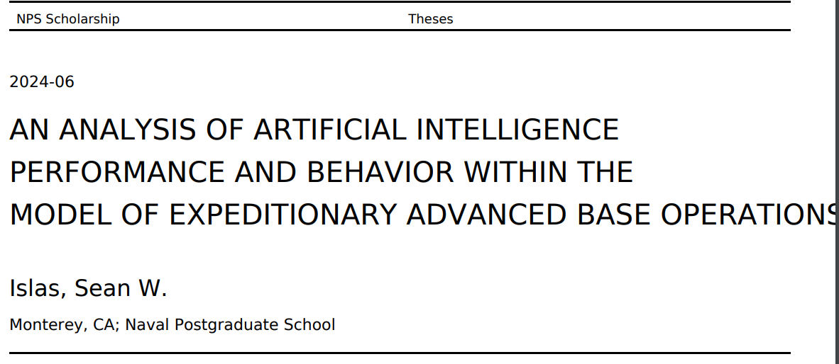 本文旨在分析人工智能(AI)在远征先进基地作战(EABO)中的应用,重点是作战和后勤行动。使用 Atlatl 作为模拟引擎,在模拟待命部队在两栖环境中分布式作战所面临挑战的场景中测试了多个智能体。测试了每种人工智能在军事行动临界值以下开展维持行动的能力,以及在越过临界值时抵御两栖攻击的能力。就脚本智能体而言,事实证明,根据联合作战方法对行为进行调整可创造出生存能力更强的人工智能,同时保持其杀伤力水平。就建立在神经网络基础上的智能体而言,由于问题的规模和范围,其性能受到了限制,可能需要进行更多的研究才能显示出显著的效果。这项研究是继续开发 EABO 概念的探索工具,可为继续完善操作概念提供反馈。