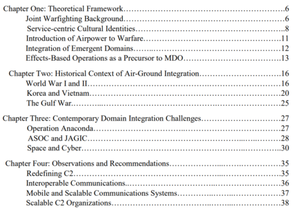 第一章从联合组织与责任、以军种为中心的文化等角度回顾了美国国防部的领域整合理论框架,并对 20 世纪引入空中力量这一挑战进行了研究。第一章还研究了过去联合作战和基于效果的作战(EBO)的方法、面临的困难以及如何为 MDO 提供借鉴。第二章讨论了从第一次和第二次世界大战到 1991 年海湾战争等过去空地一体化的具体实例,并重点介绍了其成功经验和面临的挑战。第三章继续按时间顺序,探讨了 9/11 后全球反恐战争初期 “蟒蛇行动 ”期间一体化所面临的挑战,同时研究了当代 ASOC、其当前的条令组织以及在新的 JAGIC 框架内的作用。第三章还概述了美军最近如何寻求整合太空和网络这两个新兴领域。最后,第四章总结了前几章的内容,并借鉴其中的轶事,就空军如何整合其所有领域职责以支持地面部队提出了意见和建议。