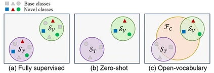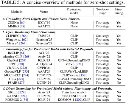 在第 3 章节的零样本部分,为了规范当前的研究,如论文表 5 所示,作者将零样本设置分成 4 种情况,分别是(a)定位新类物体和未见过的名词短语,(b)开放词汇的视觉定位,(c)基于预训练模型和已有 Proposal 情况下的免微调 / 免训练学习,(d)在预训练模型基础上免 proposal 和免微调的直接定位。如图 10 所示为全监督设置、传统零样本设置和开放词汇视觉定位设置的语义示意图。