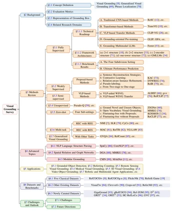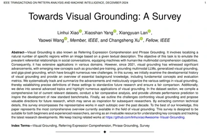 视觉定位(Visual Grounding)也被称为指代表达文本理解(Referring Expression Comprehension)和短语定位(Phrase Grounding)。它涉及根据给定的文本描述在图像中定位自然数量的特定区域。该任务的目标是模拟社会对话中普遍存在的指代关系,使机器具有类似人类的多模态理解能力。因此,视觉定位在各个领域有着广泛的应用。然而,自 2021 年以来,视觉定位取得了重大进展,比如,基于定位的预训练、定位多模态大语言模型、广义视觉定位、多图片定位、千兆像素定位等新概念不断涌现,带来了许多新的挑战。在本综述中,我们首先回顾了视觉定位的发展历史,并概述了基本的背景知识,包括视觉定位的基本概念和评估指标。我们系统地跟踪和总结了当前视觉定位的发展,并精心整理了各种已有的设置,并建立了这些设置的精确定义,以规范未来的研究并确保不同方法之间公平的比较。此外,我们深入讨论了几个高级话题,并强调了视觉定位的许多应用。在数据集部分,我们编制了当前相关数据集的列表,同时在 RefCOCO/+/g 系列数据集上进行了公平的比较分析,并提供了最终的性能预测,以启发未来新的标准测试基准的提出。最后,我们总结了视觉定位当前所面临的挑战,并为未来的研究提出有价值的方向,这可能为后续的研究人员提供启发。本综述通过提取常见的技术细节的方式进行叙述,进而以涵盖过去十年中每个子主题的代表性工作。据我们所知,本文是目前视觉定位领域最全面的综述。本文不仅使适用视觉定位的入门研究者,也适用于资深的研究人员用于跟踪最新的研究进展。