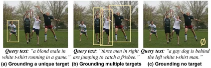 具体来说,在该综述中,在第 1 章简要地回顾了视觉定位的发展历史和当前存在的问题。在第 2 章中,研究者将介绍背景知识,包括基本的任务定义、评价标准和强相关的研究领域。除了图 1 所示的经典视觉定位之外,作者还重点介绍了近期的一种新型设置:广义视觉定位。如图5所示,在广义视觉定位的定义之下,定位任务打破了传统一个文本必然定位一个物体的强假设限制,从而转为需要定义自然数个物体(即,一个,多个,和零个物体)。