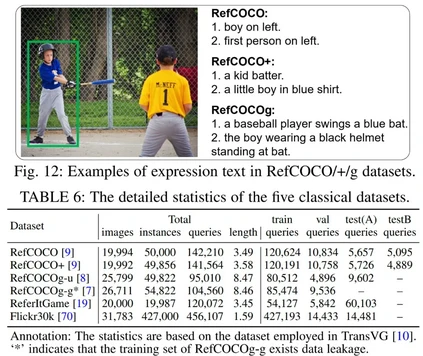 如图 2 为 RefCOCO/+/g 数据集的差异对比及统计信息样例。其中,RefCOCO 以简单的空间方位关系为主(如,左右、前后),RefCOCO + 中禁止使用空间方位词而更关注物体的外观(如,颜色、大小等),RefCOCOg 则使用更为复杂的句子。RefCOCO/+/g 这三个数据集的出现奠定了后续视觉定位任务的坚实基础,同时也成为后续近十年来的标准基准。从那以后,大量的视觉定位工作开始喷涌而出。