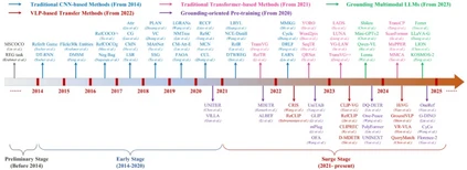 随着时间的推移,在 2021 年,Kamath 等人将主流的细粒度检测数据集进行混合,同时将定位任务作为一个调制的检测任务,定位的预训练数据得到进一步的扩大,从而使得视觉定位的性能有了进一步的提升。随后,随着 2021 年预训练范式的出现(如,VLP 和 MLLMs),近些年也涌现出了更大规模的细粒度数据集,如 GRIT 等,不断的推进视觉定位任务走向新的高峰。