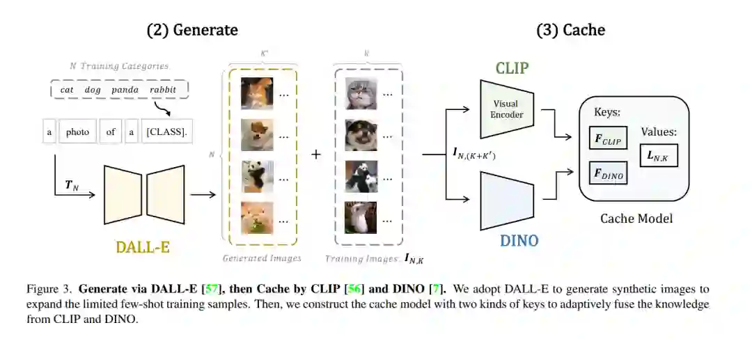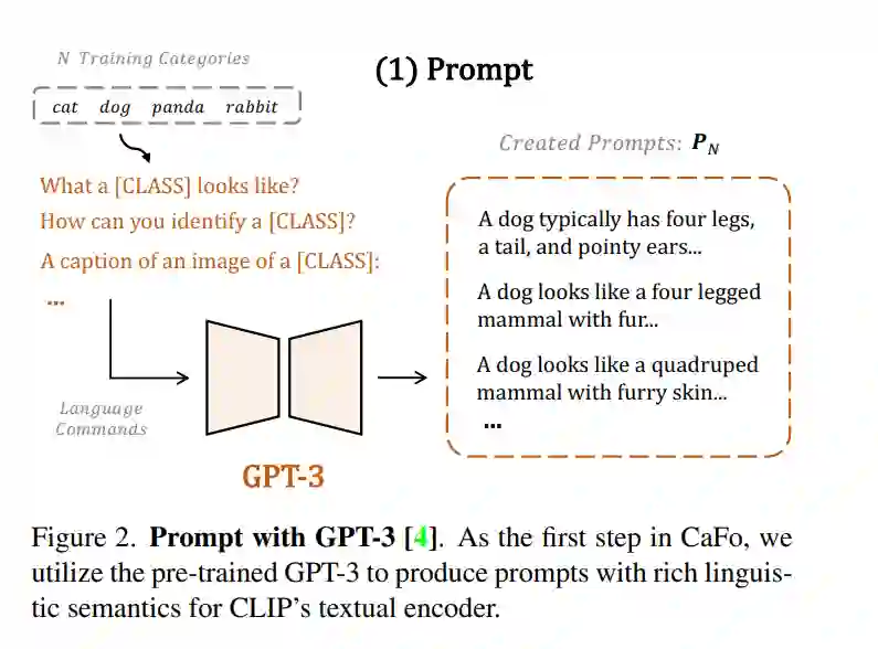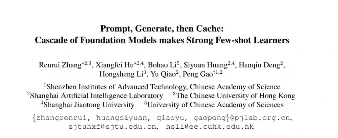 低数据环境下的视觉识别需要深度神经网络从有限的训练样本中学习广义表示。最近,基于CLIP的方法显示出有希望的少样本性能,得益于对比性语言-图像预训练。提出问题,是否可以通过级联更多样化的预训练知识来进一步辅助少样本表示学习。本文提出CaFo,一种级联的基础模型,融合了各种预训练范式的各种先验知识,以实现更好的少样本学习。CaFo融合了CLIP的语言对比知识、DINO的视觉对比知识、DALL-E的视觉生成知识和GPT-3的语言生成知识。具体来说,CaFo的工作原理是“提示,生成,然后缓存”。首先,利用GPT-3为具有丰富下游语言语义的提示片段产生文本输入。然后,通过DALL-E生成合成图像,以在不需要任何人工的情况下扩展少样本训练数据。最后,提出一种可学习的缓存模型来自适应地融合CLIP和DINO的预测结果。通过这种合作,CaFo可以充分释放不同预训练方法的潜力,并将它们统一起来,以执行最先进的少样本分类。代码可以在https://github.com/ZrrSkywalker/CaFo上找到。
