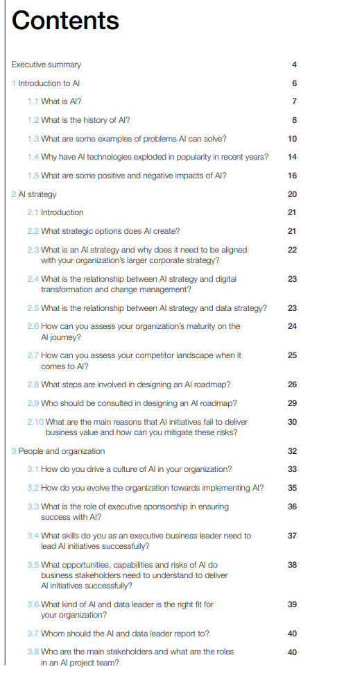该报告是对上届世界经济论坛指导董事会如何应对人工智能工作的补充,并提供了一套工具,可以帮助企业高管了解人工智能对各个方面的影响,并就其未来做出明智的决策,落地实施。该工具包是来自不同公司和行业的几位人工智能专家和执行官合作的结果,由人工智能战略、负责任的人工智能和人工智能实施等五个主要领域组成。关于人工智能战略,该报告清楚地解决了一些基本问题,例如人工智能创造的战略选择是什么,为什么它需要与组织的整体战略保持一致,以及如何简单地评估组织在人工智能之旅中的成熟度。