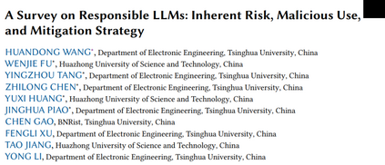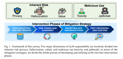 总体而言,我们将LLMs的潜在危险和脆弱性分为两类,即固有风险和恶意使用(见图1)。就固有风险而言,LLMs可能会暴露其用于预训练或微调的语料库中的敏感信息,从而引发隐私泄露问题 [37, 145, 226]。同时,众所周知,LLMs可能会出现幻觉现象,导致生成不准确和误导性的文本 [194]。最后,由于LLM生成文本中嵌入的价值通常直接反映了其训练数据的分布,这些数据通常来自互联网,因此LLMs可能会过度拟合于某一狭窄的价值集,甚至放大不良和不道德的内容,从而导致价值不匹配。在恶意使用方面,LLMs可能被用来生成有害内容,如仇恨言论、骚扰、网络欺凌,对人类造成伤害 [25]。此外,恶意用户可能会越狱LLMs,绕过其安全限制,进行欺诈性目的 [123, 225]。在缓解策略方面,我们将开发和使用LLMs的全过程分为四个阶段,即数据收集与预训练、微调与对齐、提示与推理、后处理与审计,并根据操作的阶段对现有研究进行分类。 在本文中,我们系统总结了近期在构建负责任LLMs方面的研究进展,涵盖了在隐私保护、幻觉减少、价值对齐、有害性消除和破解防御等方面增强LLM性能的技术。与现有的综述不同,后者主要关注单一维度以改善LLM的责任性(例如隐私 [37, 145, 226] 或幻觉 [194]),我们的综述采用统一框架,分析并比较涵盖更广泛维度的现有研究。这一全面的分析有助于我们理解这些不同维度之间的共性和差异,从而更深入地了解构建负责任LLMs的现状和未来方向。 本综述的结构如下:第二节回顾与负责任LLMs相关的现有综述,并对比它们与本文的主要区别;第三节正式介绍并比较构成LLM准备和应用过程的四个阶段;接下来的第四至第八节分别详细介绍现有研究在隐私保护、幻觉减少、价值对齐、有害性消除和破解防御方面的成果;最后,第九节总结负责任LLMs的开放挑战和未来方向,第十节对本文进行总结。