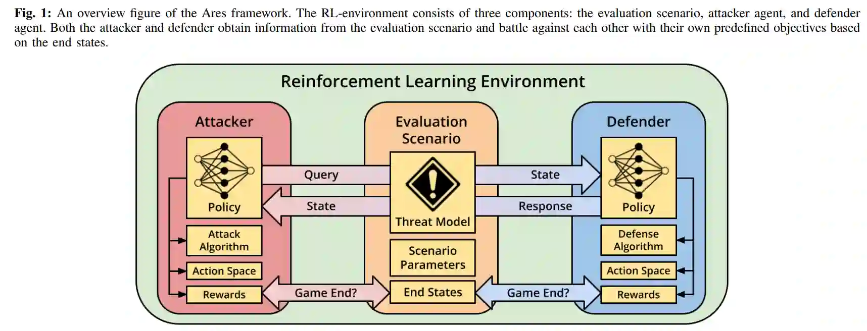 在本文中,我们描述了一个新的评估框架--Ares,它将对抗性攻击场景表现为攻击者和防御者之间复杂的、动态的互动。我们将攻击者和防御者之间的冲突作为强化学习(RL)环境中的两个独立Agent来探索,其目标是对立的,为对抗性ML评估创造了一个更丰富、更真实的环境。通过利用这种RL环境,我们能够将攻击者或防御者的策略(RL策略)调整为静态的、随机的、甚至是可学习的。Ares还允许调查白盒和黑盒威胁模型,从先前评估的局限性中汲取灵感。