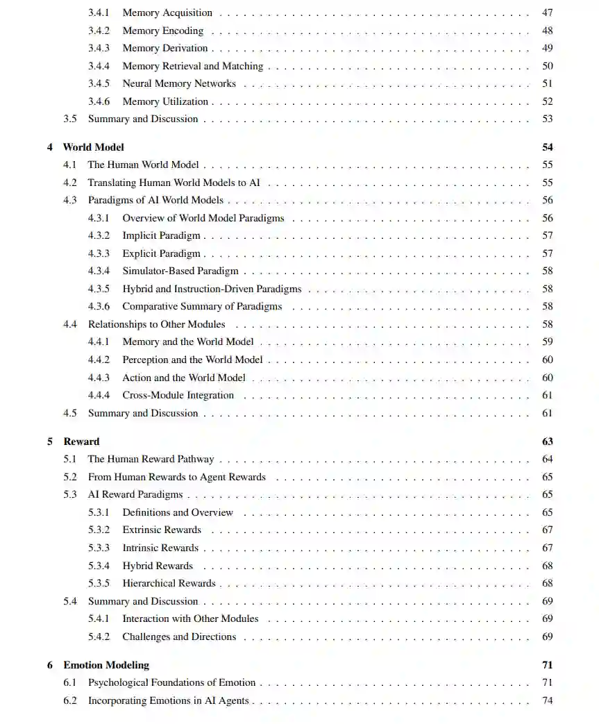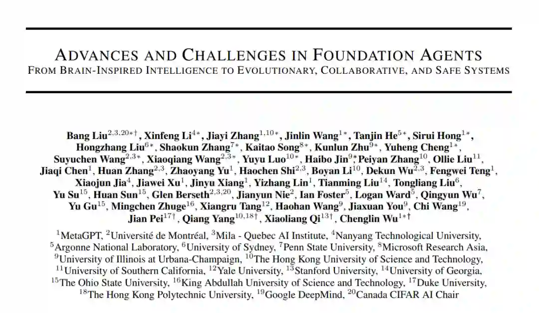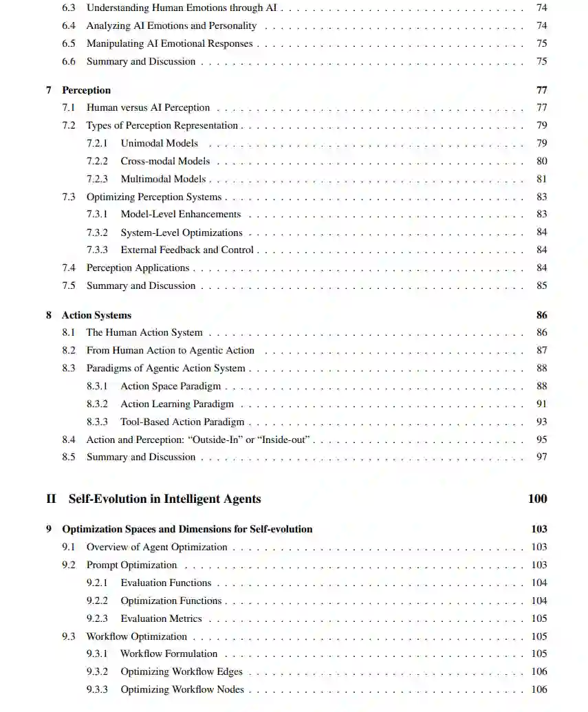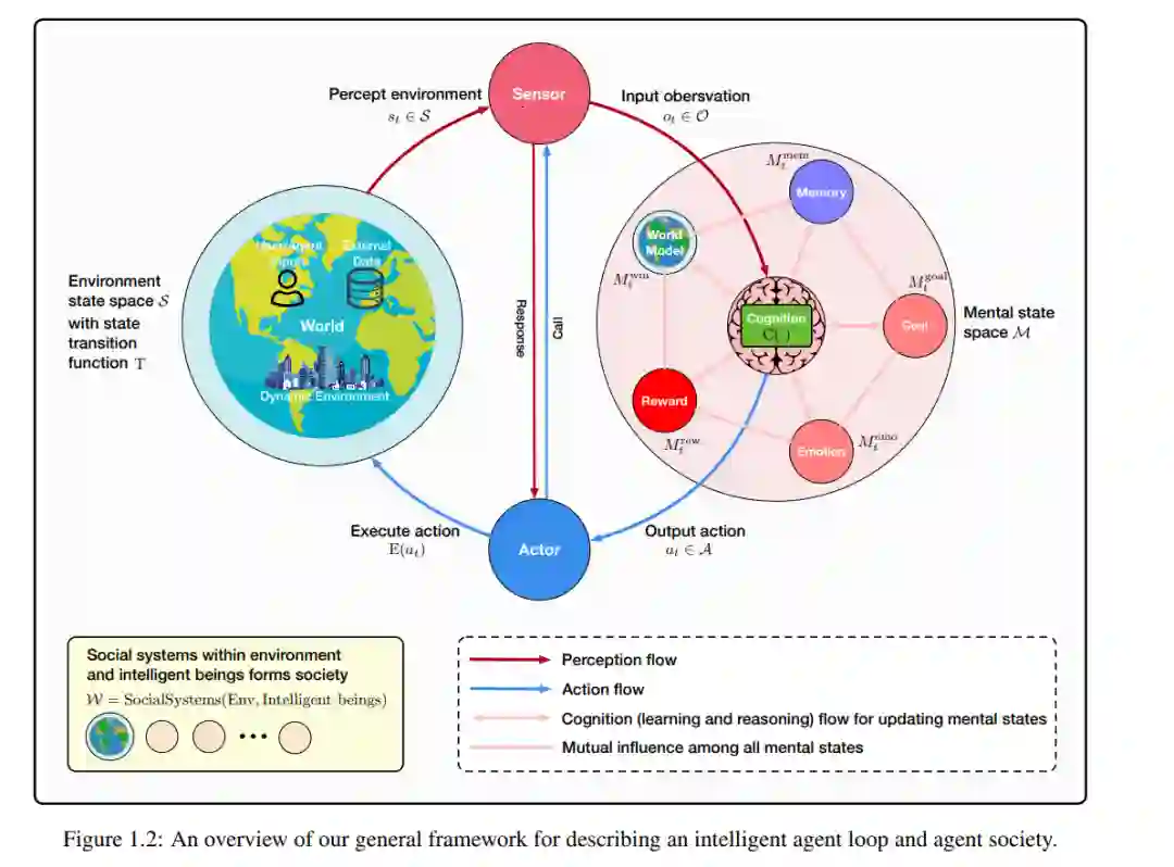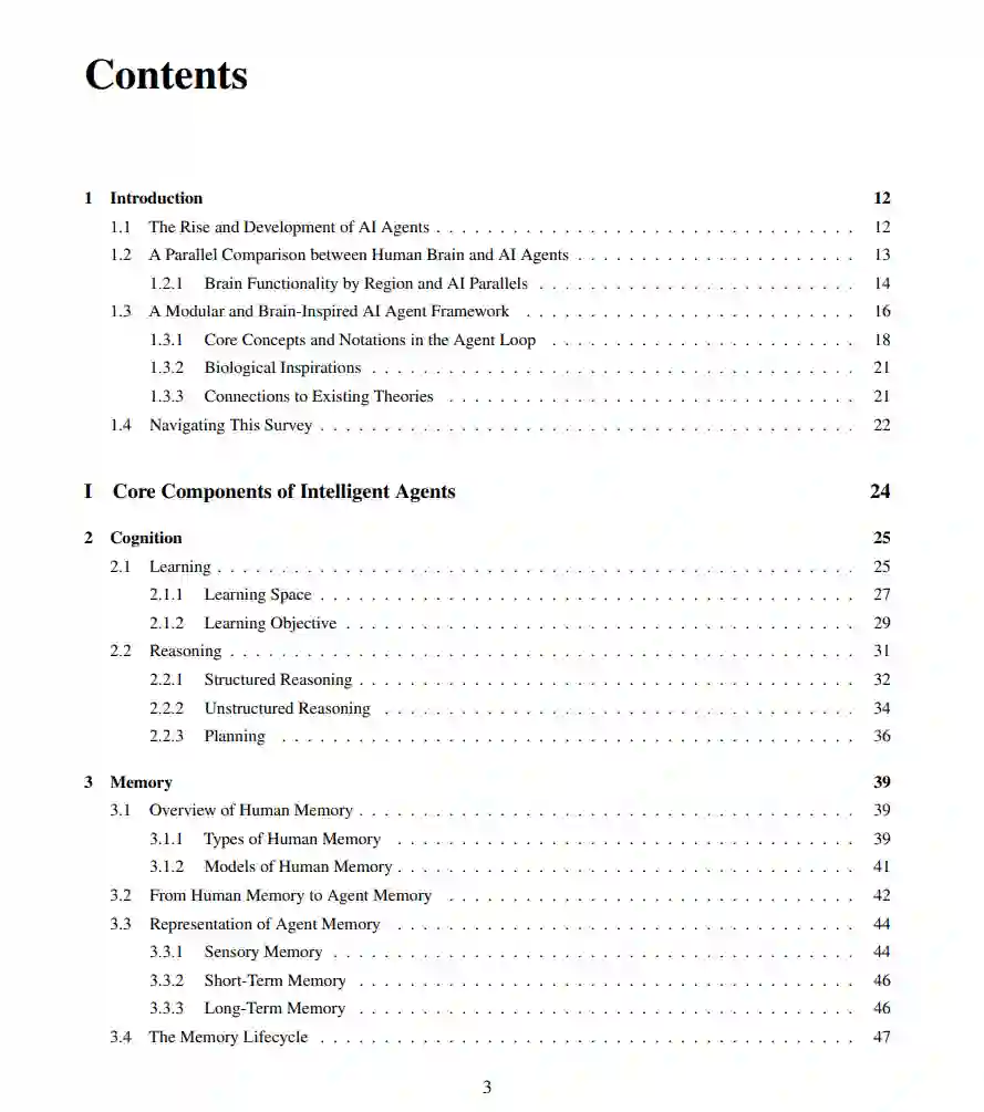 大型语言模型(LLMs)的出现引发了人工智能领域的深刻变革,推动了具备复杂推理能力、强大感知能力和多样化行为能力的高级智能体的发展。这些智能体正日益成为推动人工智能研究与实际应用的核心力量,其设计、评估与持续优化也带来了复杂且多维的挑战。 本综述提供了一个全面的视角,将智能体置于一种模块化、类脑启发式的架构之中,融合了认知科学、神经科学与计算研究的核心原理。我们的讨论分为四个相互关联的部分: 第一部分,我们探讨智能体的模块化基础,系统性地将其认知、感知与执行模块映射到人脑的功能结构上,并详细解析诸如记忆、世界建模、奖励处理以及类情感系统等关键组成部分。 第二部分,我们聚焦于智能体的自我增强与适应性进化机制,研究其如何通过自动优化范式实现能力的自主提升、对动态环境的适应与持续学习,涵盖新兴的AutoML技术与LLM驱动的优化策略。 第三部分,我们考察协作式与进化式多智能体系统,探索由智能体间的交互、合作与社会结构所涌现出的集体智能,并指出其中与人类社会行为的诸多相似之处。 第四部分,我们讨论构建安全、可靠与有益的人工智能系统的紧迫性,强调内在与外在安全威胁、伦理对齐、系统鲁棒性以及实际可行的风险缓解策略,从而实现可信赖的现实部署。 通过融合模块化AI架构与多学科的研究洞见,本综述明确了关键的研究空白、挑战与机遇,旨在激发技术创新,推动技术进步与社会福祉的有机结合。