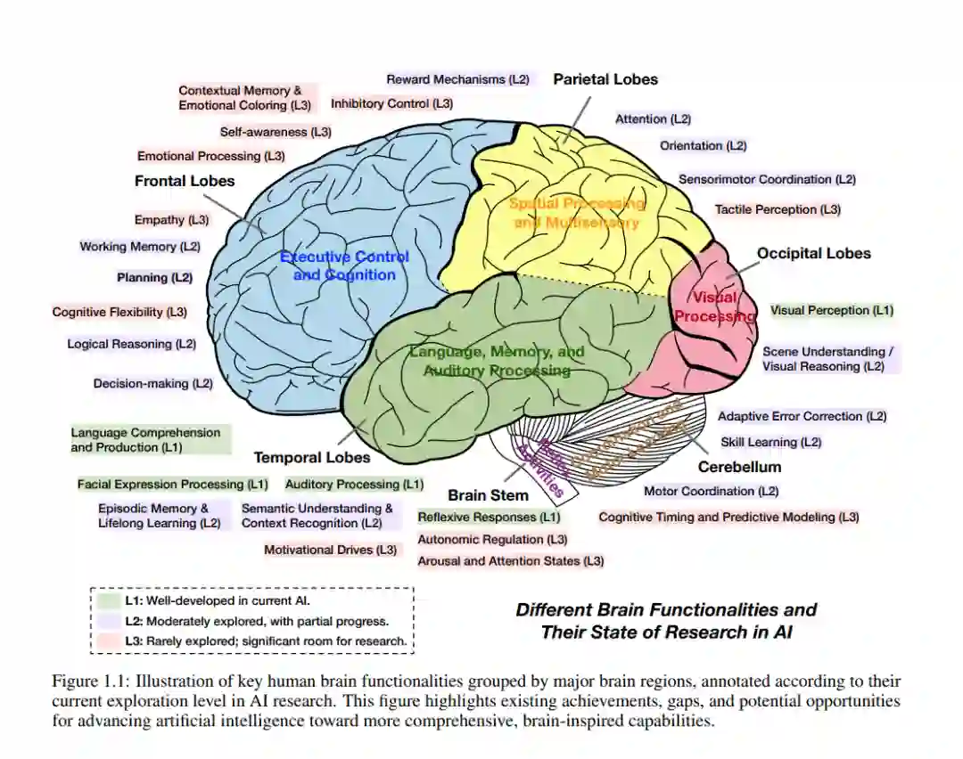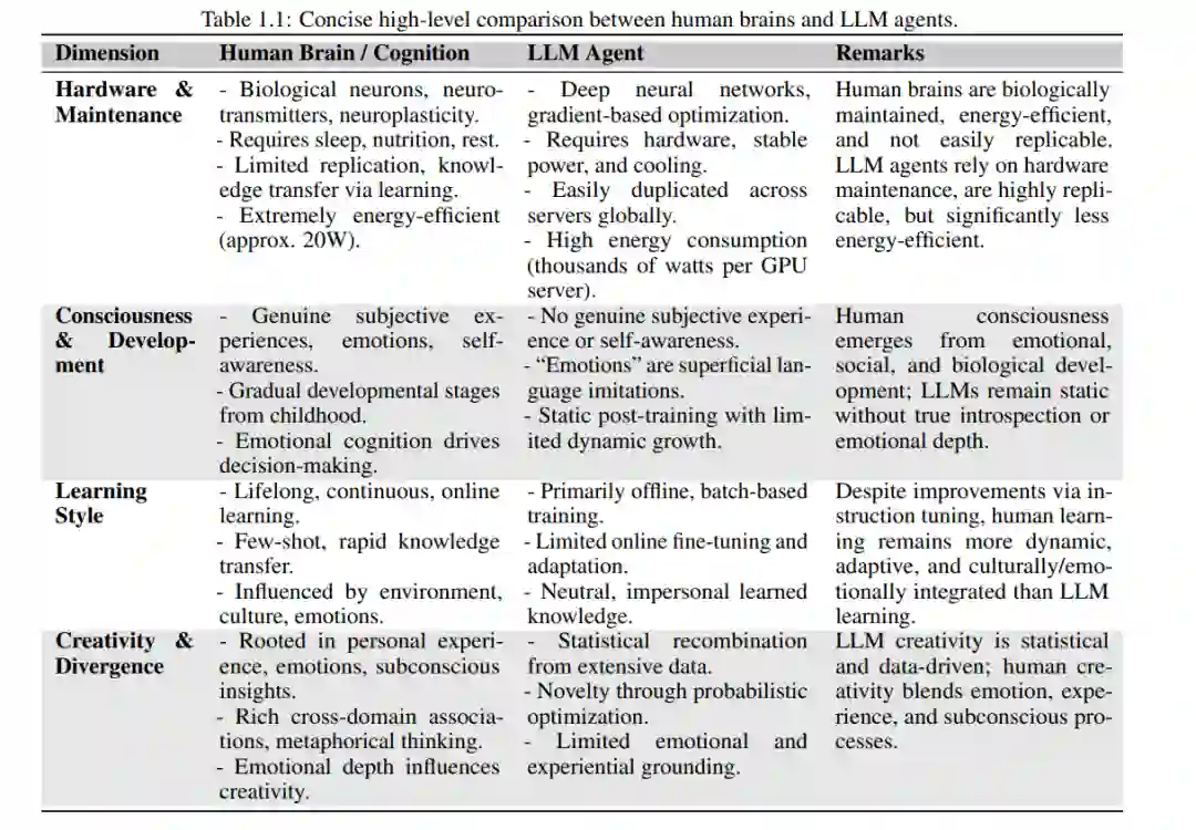 大型语言模型迅速融入智能体架构,推动人工智能飞速发展,也凸显出AI系统与人类认知之间的根本差异。如表 1.1 所示,在“硬件”基础、意识状态、学习方式、创造力与能效等维度上,基于LLM的智能体与人类认知存在显著不同。然而,这种比较仅提供了一个高层次的概览,远非对人类智能的全面刻画,同时也未能穷尽AI智能体所具备的全部特性。 人类智能运行于生物硬件——大脑之上,其能效极高,能够以极低的代谢成本实现终身学习、推理与适应性决策。而当前AI系统则依赖高计算资源,在执行类似认知任务时能源消耗显著更高。这一性能差异突显了“能效”作为未来AI研究的重要突破口。 在意识与情感体验方面,LLM智能体缺乏真正的主观状态与自我意识,这是人类认知不可或缺的一部分。虽然复制人类意识在AI中可能既非必要也非理想目标,但理解情感与主观体验在推理、动机、伦理判断与社会互动中的核心作用,有助于引导AI研究朝着更具对齐性、可信性与社会价值的方向发展。 人类的学习过程是持续性的、交互性的,并强烈受社会、文化与经验因素影响。而LLM智能体的训练方式主要为离线的大规模批量训练,其持续适应能力有限。尽管诸如指令微调(instruction tuning)与人类反馈强化学习(RLHF)[12] 等方法有所改善,当前的LLM智能体仍未达到人类那样的灵活性。终身学习、个性化适应与交互式微调等方向被认为是实现更高类人适应性的关键研究路径。 人类的创造力源于个体经验、情感洞察与跨领域联想的复杂交织;而LLM的“创造”更多表现为对已有数据的统计重组——即所谓的“统计式创造力”,在深度、原创性与情感共鸣方面仍有差距。这一差异提示我们,可通过引入更丰富的上下文理解、模拟情感状态与经验基础,来推动更深层次的AI创造力发展。 从时间尺度来看,人类大脑经过数百万年的自然选择与环境适应才形成了今日的高效、灵活与创造力,而AI智能体的技术发展不过80年,自最初的计算机模型起步至今。这种人类认知与AI系统的并行比较极具价值,不仅揭示了它们之间的类比与根本差异,也为未来AI智能体技术的发展提供了有益的指导。 最终,从人类智能中汲取灵感,将有望进一步提升AI能力,造福医疗、教育、可持续发展等多个关键领域,为人类社会带来广泛的积极影响。