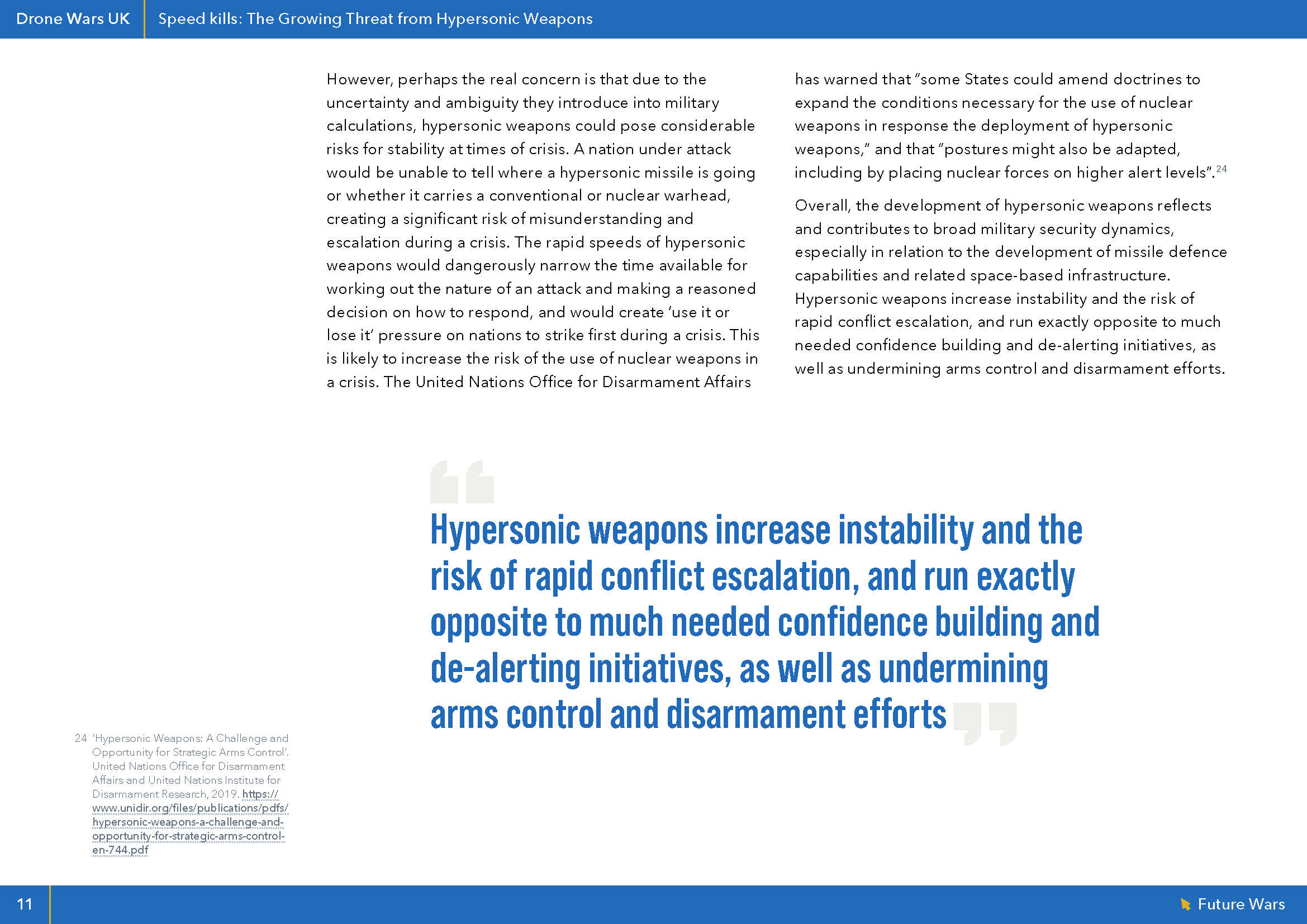 虽然这些武器大多处于开发阶段,但一旦部署,它们可能会带来巨大的不稳定并威胁全球和平与安全,尤其是在危机时期。一个受到攻击的国家将无法判断高超音速导弹的去向,或者它是否携带核弹头,从而造成误解和升级的重大风险。高超音速武器的速度将危险地缩短可用于确定攻击性质并就如何应对做出合理决定的时间,并将给各国施加“使用它或失去它”的压力,要求他们首先发动攻击。