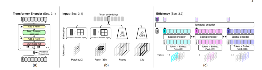 视频Transformers(vt)的通用框架。在(a)中,我们展示了一个普通的Transformer Encoder1;在(b)中,我们展示了不同的标记化和嵌入策略,具体见3.1节;在(c)中,我们展示了一种常见的分层Transformer设计,它分解了视频片段的空间和时间交互。这些和其他视频设计在第3.2节中有描述。