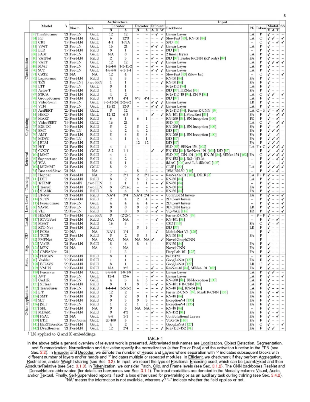 视频。本工作的重点是全面分析用于视频数据建模的Transformer架构的最新进展。请注意,在Transformer层建模之前,使用传统(非Transformer)架构将视频映射到其他结构化形式(例如,接头[27]或语音[28])的工作不在我们的范围之内。我们对使用(时间)视觉特征作为SA层输入的模型特别感兴趣。我们分析了文献采用这些模型的方式,使之能够处理视频的内在复杂性以及其他可选模态。然而,我们确实考虑在使用Transformer层之前利用某些CNN架构将视频数据嵌入到低维空间的工作(参见第3.1.1节)。