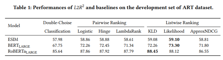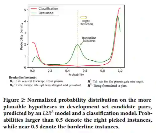 外展自然语言推理任务(αNLI)提出了评价诱导的学习系统的推理能力。对于αNLI任务,两个观测给出最合理的假设被要求选出的候选。现有的方法简单地将其表示为一个分类问题,因此在训练过程中使用了交叉熵对数损失目标。然而,区分真假并不能衡量一个假设的可信性,因为所有的假设都有发生的机会,只有概率是不同的。为了填补这个空白,我们切换到一个排序的角度,按照假设的可信性排序。在此基础上,提出了一种新的基于学习排序的L2R2方法。首先,将训练样本重新组织成一个排序形式,将两个观察值及其假设分别作为查询和一组候选文档。然后,得到一个ESIM模型或预先训练好的语言模型,如BERT或RoBERTa,作为打分函数。最后,对于训练,排序任务的损失函数可以是成对的,也可以是列表式的。在ART数据集上的实验结果达到了公共排行榜上的最高水平。
