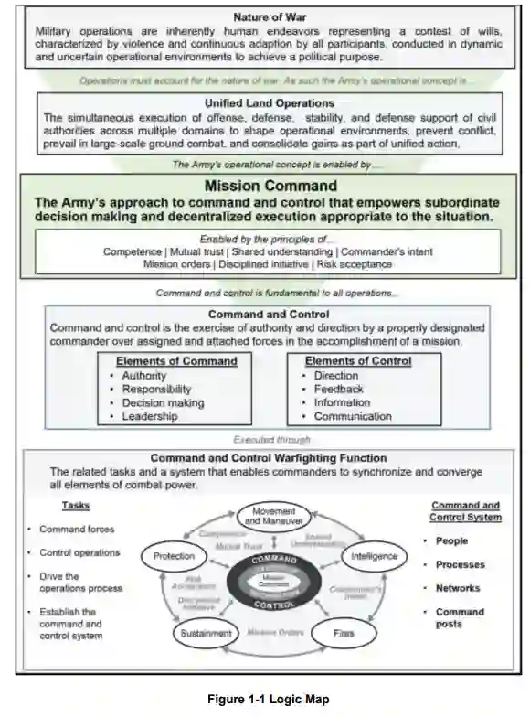 本出版物已更新指挥控制作战职能内容,而先前版本依据条令中仍称"任务式指挥作战职能"的时期编写。指挥控制系指经正式任命的指挥官为完成任务对所属配属部队行使的指挥权与领导权(参见联合出版物JP 1)。陆军将任务式指挥定义为实施指挥控制(亦称C2)的陆军方式,旨在根据具体情境赋能下属决策与分散执行(陆军条令ADP 6-0)。为辅助指挥部队与控制作战行动,指挥官建立其指挥控制系统——即人员编组、流程规范、网络架构及指挥所体系的组合,使指挥官得以实施作战行动(ADP 6-0)。高效指挥官运用本出版物提升指挥控制系统战备状态,确保部队做好实施联合地面作战的准备。
