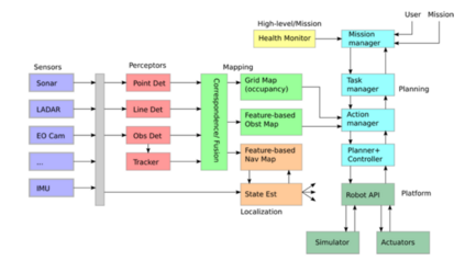 图 (1.3) 显示了 CAVR 二级控制器架构的整体软件架构。它使用 Linux 操作系统(Ubuntu 18.04)和机器人操作系统(ROS)Melodic Morenia 作为软件中间件。每个方框代表一个 ROS 节点。信息从左到右流动。方框的颜色反映了 ROS 节点的功能。从各种传感器(紫色)收集数据。感知器处理传感器数据(粉色),并将这些信息输入映射组件(绿色)。这些信息将作为路径规划和状态估计(橙色)的输入。