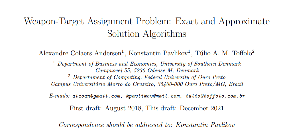 WTA 问题可追溯到 20 世纪 50 年代末,此后一直被广泛研究。在 Merrill Flood 于 1957 年 3 月 13-15 日在普林斯顿大学线性规划会议上对该问题进行非正式描述后,Manne(1958 年)正式提出了该问题。曼恩在论文中指出,在所有可用武器都相同的假设条件下,可以设计出该问题的线性规划方案。不久之后,小登布罗德等人(1959 年)开发了一种算法,通过将武器依次分配给生存概率边际递减最大的目标,对曼恩提出的问题进行了最优分配。这种算法被称为最大边际收益算法。戴伊(1966 年)对问题的维度和复杂性进行了进一步研究,通过将分配问题分解为较小的目标选择问题,为解决较大的目标选择问题提供了信息,从而大大降低了问题的维度。
