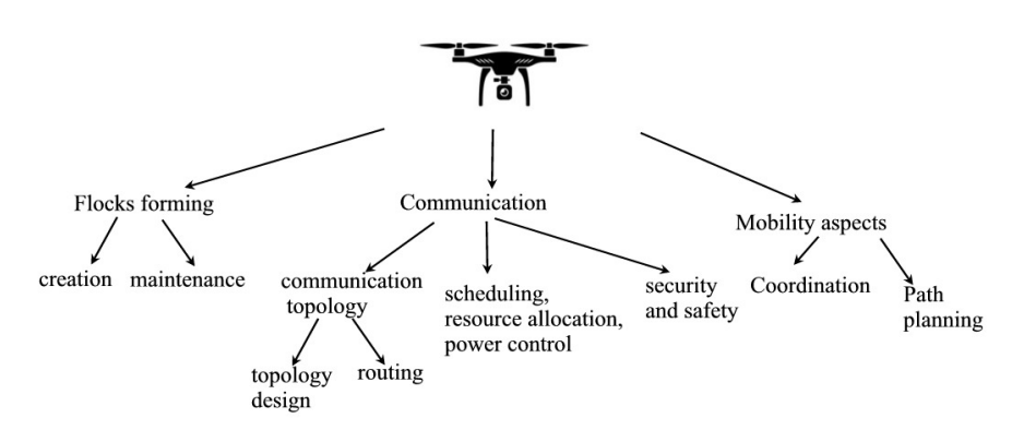 除了前面提到的即使是单架无人机也会遇到的挑战之外,在考虑多架无人机的环境时,也会出现某些任务和问题,在这种环境中,小或大的群体应该一起行动,或应该在相同的空中环境中行动。例如,无人机网络的形成、无人机的聚类与协调、无人机网络中的资源配置等问题需要考虑并有效解决。图1提供了与无人机相关的各种主题的层次描述。