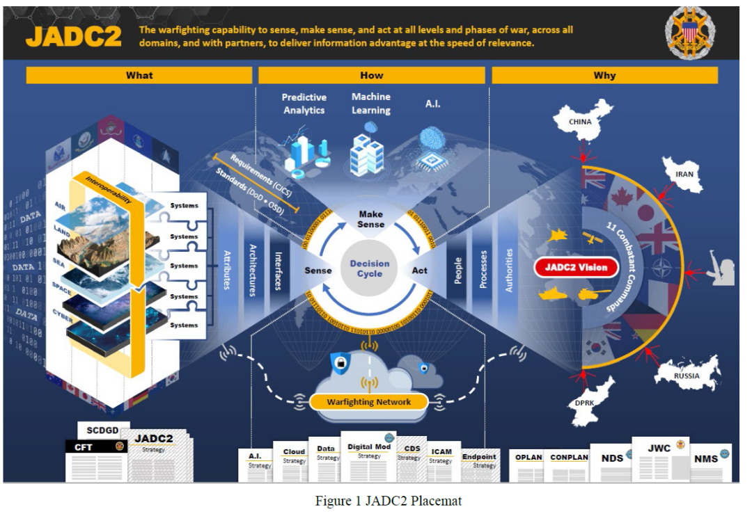 联合全域指挥与控制 (JADC2) 是美国国防部 (DOD) 的概念,旨在将来自所有军事部门(空军、陆军、海军陆战队、海军和太空部队)的传感器连接到一个网络中。传统上,每个军种都开发自己的战术网络,这与其他军种不兼容(例如,陆军网络无法与海军或空军网络连接)。通过 JADC2,国防部设想创建一个“物联网”网络,将众多传感器与武器系统连接起来,使用人工智能算法帮助改进决策。
