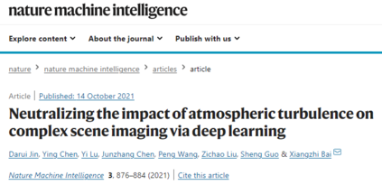 北航白相志教授团队在《Nature》子刊《Nature Machine Intelligence》(2021年第10期)以全文Article形式刊发了最新研究成果“Neutralizing the impact of atmospheric turbulence on complex scene imaging via deep learning”,提出了一种基于多尺度时空域注意力机制的生成对抗网络模型,逆向推理大气湍流效应导致的二维成像退化过程,揭示了深度学习在推演复杂随机物理过程方面的潜力。