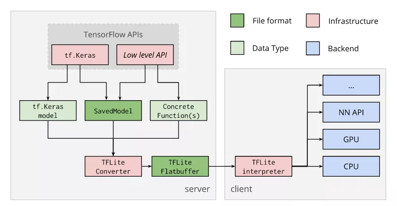 converter使用TF模型生成FlatBuffer文件(.tflite),然后将FlatBuffer文件部署到客户端设备(例如移动设备,嵌入式设备)并使用TensorFlow Lite解释器在本地运行。下图显示了此转换过程: