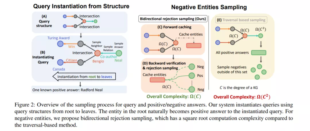 为了应对这些挑战,我们提出了可扩展多跳推理(Scalable MultihOp REasoning, SMORE),这是第一个在大规模KGs上进行单跳和多跳推理的通用框架。在算法方面,关键是在线高效地生成训练实例。为了生成具有一组正实体和负实体的训练示例,我们首先从一组查询逻辑结构(图2(a))实例化给定KG(图2(B))上的查询。实例化查询的根代表一个已知的正(答案)实体。为了获得一组负实体(非答案),简单执行查询计算计划(图1(B)),使用KG遍历(图1(C))来识别正/负实体,其复杂性与查询的跳数呈指数关系。因此,我们提出了一种双向拒绝抽样方法来有效地获取实例化查询的高质量负实体。训练数据采样器的关键思想是通过动态规划确定计算方案的最优节点割(图2(C)中的红色节点),同时进行正向KG遍历(图2(C))和反向验证(图2(D)),从而实现双向拒绝采样。最优切割中的节点缓存前向KG遍历的中间结果;对于向后验证,我们提出正的和负的候选实体,向后遍历最优切割,并基于前向和后向集的重叠执行拒绝抽样。这将最坏情况的复杂性降低了一个平方根,这使得在运行中生成一个训练查询、一个正答案实体和一个负非答案实体是可行的。