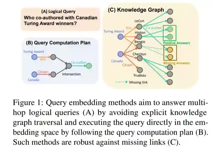 对此类KGs的推理包括两类任务: (1)单跳链接预测(也称为知识图谱补全),其中给定一个头和一个关系,目标是预测一个或多个尾实体。例如,图灵奖?(即,谁是图灵奖得主?),目标是预测实体GeoffHinton, DonKnuth等; (2)多跳推理,其中一个需要预测(一个或多个)多跳逻辑查询的尾部。例如,回答“谁是加拿大图灵奖得主的合作者?””(图1 (A)))。寻找这类查询的答案需要输入和预测两条并行路径上的多条边,同时还需要使用逻辑集运算(如交集、并集)。图1(B)显示了查询计算计划,为了确定实体是如此复杂的多跳查询的答案,通常需要隐式地推断缺失的链接,如图1(C)所示。请注意,这两个任务彼此密切相关。知识图补全可以看作是一个多跳推理任务的特殊情况,当查询由单个关系(例如,France-CapitalOf - ?)组成。多跳推理是知识图谱补全的一种严格的推广方法,具有更广泛的适用性,但也有其独特的计算和可扩展性挑战。