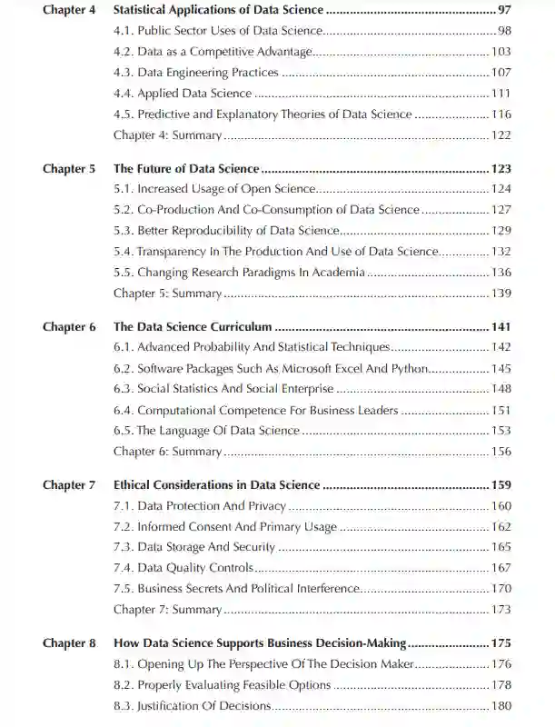 本书探讨了数据科学的基本原理。它考虑了现代数据科学的发展方式和原因。这本书在将数据应用于决策方面比现有的书籍走得更远。这本书不仅对本科生有用,还能帮助企业主提高决策能力。本书使用现实生活中的例子,探讨了基于信息的决策框架的可能性和局限性。 https://www.arclerpress.com/book/chemistry/data-science-for-business-and-decision-making-an-introductory-text-for-students-and-practitioners.html 我们生活在一个信息至关重要的世界。它是一种在公开市场上买卖的商品。鉴于信息的重要性,必须确保其投入和产出的质量足够稳健,以满足整个社会的需要。在商业领域,信息是最重要的。如今,许多商业决策都依赖于信息。事实上,信息的质量可以直接影响决策的质量。这本书被认为是信息科学的导论。具体来说,本书试图探索数据科学作为一个新兴学科在一个信息社会的更广泛的背景下。这本书倾向于关注信息在决策中的作用。从这个意义上说,这本书部分驳斥了那些认为商业头脑完全取决于直觉或直觉的人。科学方法因其精确、有条理而被广泛应用于各个领域。科学取代了一些曾经是商业决策的主要组成部分的非理性。当然,直觉也有作用,一些不依赖科学的人也能做出出色的决定。唯一的问题是,这些优秀的决定是偶然发生的,而不是经过深思熟虑的过程的结果。