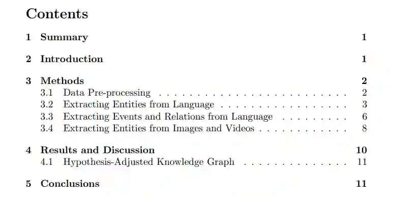 我们的方法在图1中概述,并将在以下章节中详细讨论。该管道的第一步是预处理,如图1最上面一行所示。原本以多种语言书写的原始文本文件被翻译成英文,音频和视频片段被转录并翻译成英文。这些经过翻译的数据被传递到管道的第二阶段(图1的中间一行)。在这里,相关的实体(例如,人、地方、国家)被提取出来,这些实体被用来提取连接实体的关系和事件。最后,这些实体、事件和关系被传递到管道的最后阶段(图1的底行)。我们输出一个完全成型的知识图,代表我们从原始输入文档中收集到的信息。这个知识图谱包括实体以及它们之间的联系。