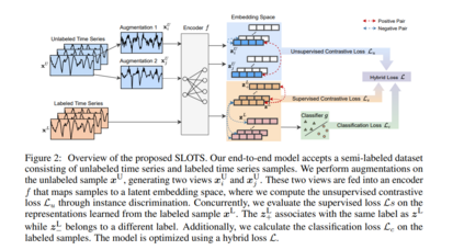 时间序列分类在金融、医疗和传感器数据分析等多个领域都是一个关键任务。无监督的对比学习在从标签有限的时间序列数据中学习有效表示方面引起了广泛关注。现有的对比学习方法中普遍的方法包括两个独立的阶段:在无标签数据集上预训练编码器,然后在小规模有标签数据集上对经过良好训练的模型进行微调。然而,这种两阶段方法存在几个缺点,例如:无监督预训练对比损失不能直接影响下游的微调分类器,以及缺乏利用由有价值的真实标签指导的分类损失。在本文中,我们提出了一个名为SLOTS(半监督时间分类学习)的端到端模型。SLOTS接收半标签数据集,其中包含大量的无标签样本和少量的有标签样本,并通过编码器将它们映射到一个嵌入空间。我们不仅计算无监督的对比损失,而且在具有真实标签的样本上测量有监督的对比损失。学到的嵌入被送入一个分类器,并使用可用的真实标签计算分类损失。无监督、有监督对比损失和分类损失被联合用来优化编码器和分类器。我们通过与五个数据集上的十种最先进方法进行比较来评估SLOTS。结果表明,与两阶段框架相比,我们的端到端SLOTS使用相同的输入数据,消耗类似的计算成本,但提供了明显优化的性能。我们在 https://anonymous.4open.science/r/SLOTS-242E 发布了代码和数据集。