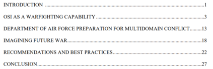 OSI 是空军部决策者了解各自行动环境中不断变化的威胁的最有力防御手段。OSI 的 CI 权限,特别是其对部队保护活动的 CI 支持,提供了比传统空军部情报和执法实体所能提供的更大的行动空间。OSI 还可以补充传统空军部情报部门在 CI 培训和经验方面的不足。OSI 的专题专家应在空军部的关键岗位上任职,以确保其创造力和勇气有助于加强空军部应对未来对手的能力。OSI 是一支具备 CI 能力的部队,可在未来战争中为空军部指挥官提供支持。