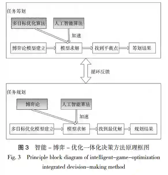 美军为应对军事优势的不断削弱,在美参联会 副主席约翰·海顿提出的“全域战”的基础上,提出 了“联合全域作战”的概念[1],其主要目的是对其所 有作战域的作战力量进行充分整合、融合,以实现美军的持续军事优势。2020 年 3 月 5 日,美空军发布 了《空军条令注解 1-20:美国空军在联合全域作战 中的作用》文件,其中,对 JADO 作出了明确定义: “为了获取战争优势并能够保证完成作战任务,多军兵种组成的联合部队在所有作战域内,经过作战 指挥官的全面筹划,开展的联合协同作战行动”[2]。 联合全域指挥控制是由美军联合参谋部指挥、控 制、通信、计算机和网络部门(J6)于 2019 年提出,关 于其内涵定义或者实现目标,美军不同部门有着基 本近似的界定,大致定义为:在美军所有部队之间, 在美军所有作战域之间,将所有作战要素进行无缝 连接,以实现所有作战力量的融合,构建智能化作 战网络体系[3-5]。作为美军提出的最新作战理念愿 景,JADO 具有很强的创新性和操作性,对我国国防 安全提出了不小的挑战。本文认为,联合全域作战 是在多域协同作战的基础上,更进一步实现所有作 战域的跨域融合,真正实现战争复杂体系的体系作 战。一方面,利用复杂体系的适应性、涌现性等优势 特性,实现己方所有作战域作战能力的融合、聚合, 提升并保证作战效果;另一方面,利用复杂体系的 不确定性、非线性等劣势特性,对地方作战 OODA 环形成战争迷雾干扰,建立己方的态势优势、决策 优势和行动优势。 关于智能指挥决策的相关理论和技术问题,胡 晓峰在智能指挥决策的不同层面上,论述了游戏博 弈与作战对抗在指挥决策上的差别,对目前人工智 能技术运用到作战中的不足和局限进行了分析总 结,同时也给出了解决问题的思路[6];张婷婷等从 决策与控制的相互作用关系为视角,设计马赛克作 战模式的递归拼图计算体系,实现组合作战资源自 主执行和自动化控制,减少指挥决策人员在行动层 次的工作负载[7];金欣等从知识学习和博弈学习两 条技术路线出发,提出了基于人机混合智能方式, 来对作战指挥领域智能进行培育的思路,并指出了 其中的关键技术[8];陈晓轩等针对当前基于兵棋研 究的空战编组对抗方法主要使用规则或运筹等手 段,存在假设不够合理、建模不准确、应变性差等缺 陷,提出了一种知识数据和强化学习相结合的空战 编组对抗智能决策方法[9]。本文针对联合全域指挥控制下的智能指挥决 策问题,从定性定量分析研究的角度出发,提出了 指挥决策所包含的两大主要内容为任务筹划和任 务规划,并在此基础上从引入人工智能方法技术入 手,提出了一种基于人工智能和博弈论、多目标优 化相结合的指挥辅助决策方法,即智能 - 博弈 - 优化一体化指挥决策方法,并给出了此方法的理论框 架和功能设计。