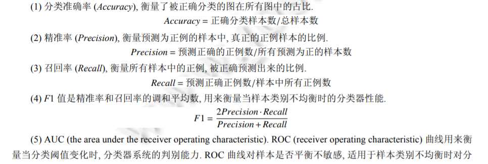 图分类方法的评价指标主要包括分类准确率, 精准率, 召回率, F1 值和 AUC, 下面分别介绍