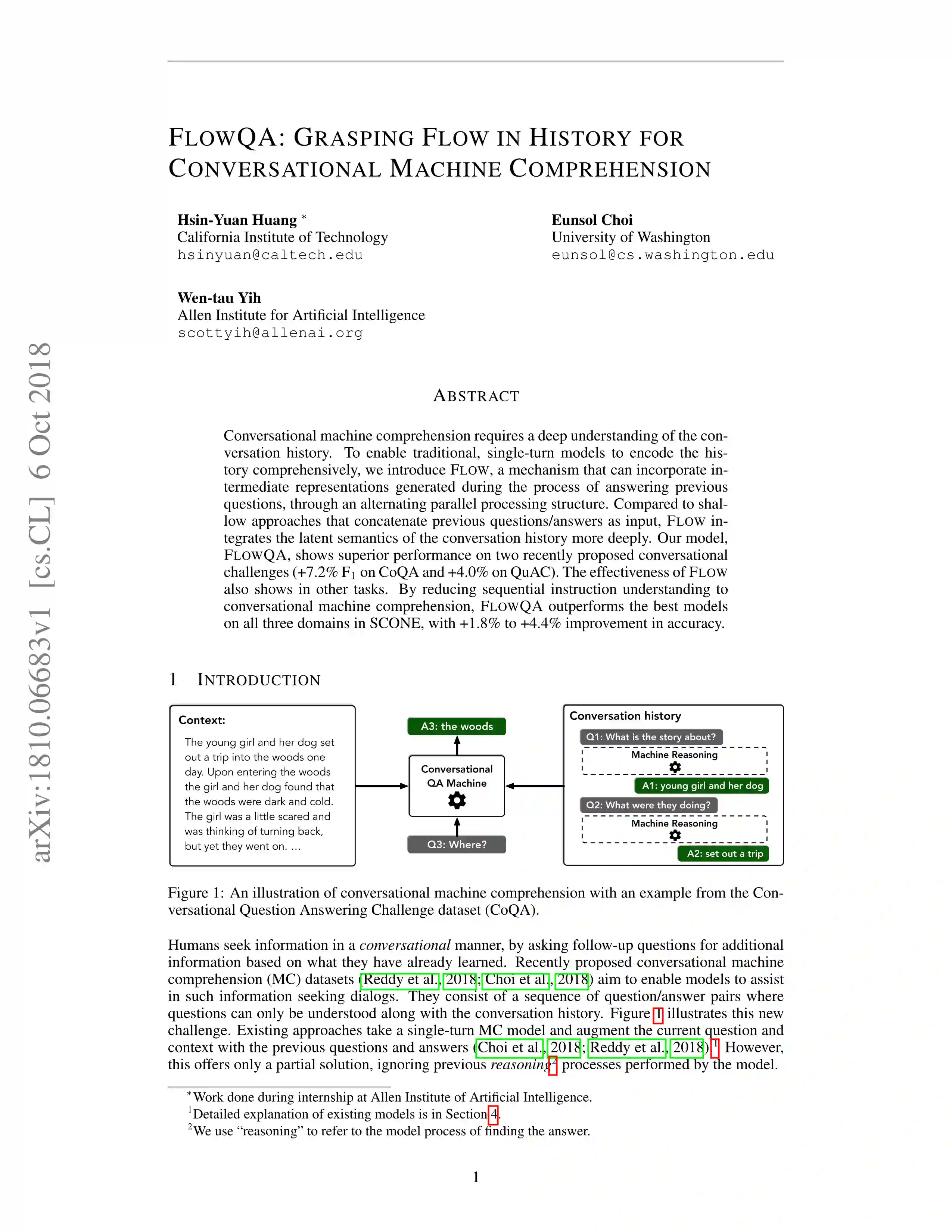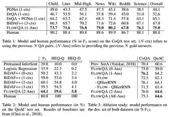 会话机器理解需要对会话历史有深刻的理解,为了使传统的单圈模型能够进行全面编码,作者引入Flow机制,该机制可以通过交替并行处理结构合并在回答先前问题的过程中生成的中间表示。与先前的将问题/答案作为输入的方法相比,Flow更深入地整合了历史对话的潜在语义。其性能也优于SCONE中的所有三个领域中的最佳模型,准确性提高了2.6%