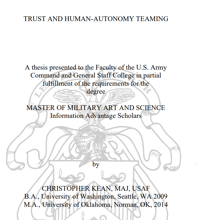 本研究论文旨在探讨人类信任的影响因素,因为它与人类-自主团队合作有关。研究采用混合方法,通过在线调查实验进行。实验分析了几个自变量和一个因变量(对人工智能(AI)系统的信任)。自变量包括个人的数字素养、人工智能系统的透明程度以及参与者对人工智能系统能力/性能的经验水平。研究人员给参与者提供了一个假定的小故事,通过随机处理来测量自变量,在这个故事中,参与者扮演了一个与假定的人工智能系统配对的操作团队中的首席规划师的角色。结果表明,无论处理条件如何,人工智能的基本信任水平都非常重要。最后,这项研究强调,人工智能系统的透明度对提高信任度的作用可能比以前想象的更加有限。