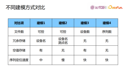 几种建模方式从文件数的角度,建模方式一和二的文件数可控,一个文件就可以存储所有数据,在文件大小超过阈值后再写入新的文件。建模三的文件数就是设备数,建模四文件数是序列数。在一个应用中希望文件数比较可控,我们更倾向使用建模一和二,整个系统的稳定性是最重要的。在存储方面,建模三和四没有冗余的数据,在一些设备数比较少时会使用建模三。建模二的冗余数据又比建模一的更多。 为什么会出现空值?一个设备假如有一万个传感器,这一万个传感器的采集时间都是一样的,此时可以存成一行,且这一行没有任何的空值。但是一旦多个传感器的采集时间不同,就无法按时间对齐,存储时会出现空值的情况,空值也会影响文件的压缩比。建模一和三都会存储空值。 由于建模方式三、四都可以规避冗余数据,因此定位速度应该是最快的。建模方式一能够避免掉一些测点的读取,建模二需要读出所有数据,所以建模二的定位速度最慢。