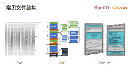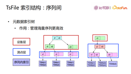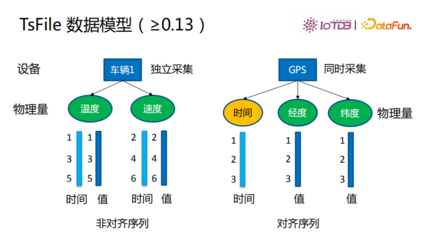 图中左侧是一个车辆有两个传感器,这两个传感器采集的时间是不对齐的,这时我们叫它非对齐的序列。那这种建模方式会把每一个时间序列里都存一列时间,这种方式是最节省空间的,没有存储任何空值。这种方式适合一个设备的不同传感器是独立采集的场景。 图中右侧这种设备GPS,有经度和纬度两个物理量,那这种数据一般都是同时采集的,会共享一列时间戳。这种方式两个列只存一列时间,我们称之为对齐序列。可以看到对齐还是不对齐应该是一个设备的属性,所以在设备层面有一个属性来做控制,在写入时也可以设置这个设备的属性。这个数据模型的特点是在0.13版本去引入的,3月会发布0.13版本。 在场景和模型的选择方面,非对齐序列更适合多物理量独立采集场景,对齐序列更适多物理量同时采集的场景。可以根据不同场景选择不同存储引擎。 ② 数据存储结构