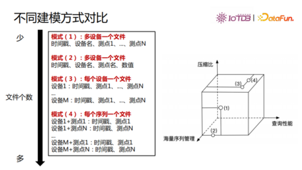 第三种建模方式是每一个设备一个文件。这种模式没有重复存储的数据,但在一个应用里设备数量较多、达到上千万量级,而上千万个文件同时写入是不能实现的方式,此外大量文件对文件系统也是负担。 第四种建模方式是一个时间序列存储为一个文件。这种方式相比第三种在实际应用中更不可行。