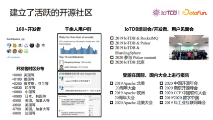 开源社区建设方面,我们运营了两年开源社区,愈发感受到开源社区核心理念的重要性。 平常在公司和团队内工作与开源社区不同,开源社区需要更多地把沟通开放出来。IoTDB是一个基于文件的开放架构,思想也要对应地开放。清华软件学院团队的工作流程都需要文档化,向社区开放,同步项目进度。 作为开源贡献者,我们每个人都希望我们提的一件被尊重,对于开源社区来说这也是一个对待贡献者的基本态度。 有些贡献者除了提一些建议外还能给贡献代码,小的修改提一个pr社区就可以审阅合并,但更大的功能模块开发就需要分布式协作了。 我们建设开源社区的思路是通过开放架构、开放思想,尊重每个人的建议和分布式协作,达到为用户提供好用的开源软件的核心目标。 2. 建立了活跃的开源社区