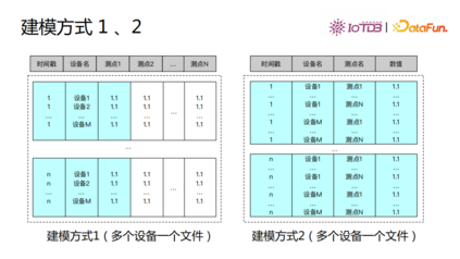 数据有多种建模方式。 一种建模方式是把所有设备数据都存到一个文件里面,此时文件中表结构第一列是时间戳,第二列是设备名,后面是这个设备的所有的测点数据。可以看到这种建模方式下,一个文件可以管理多个设备的数据,但设备名字是被重复存储的。当查询一个设备的一个测点的时间序列时,下图中建模方式1的蓝色部分需要全部读出来进行过滤后才能得到结果。 第二种建模方式也是可以在一个文件里管理多个设备的,整个文件只有四列,其中设备名和测点名是重复存储的,查询时就需要读取更多的数据,基本上需要把所有数据都查找一遍才能拿到需要的数据。