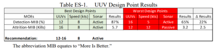性能指标包括探测效果和敌方减员。关注的性能因素(属性)包括 UUV 速度、UUV 数量(UUV 舰队组成)和声纳类型(主动或被动)。DOE 包括对这些因素在三个不同值(水平)下的测试。不同水平的因素组合产生了 18 个设计点。