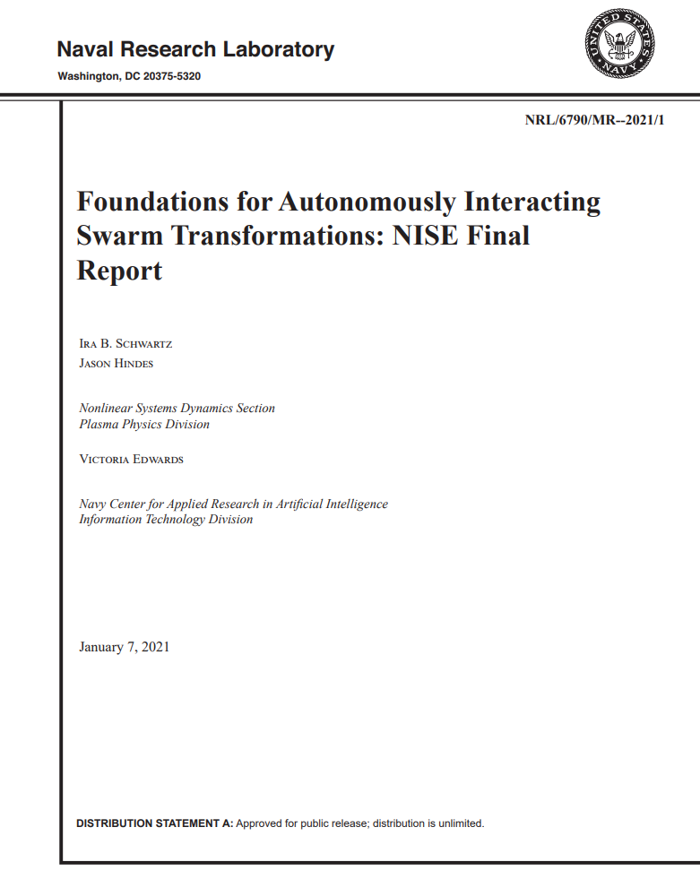 在自然界和机器人学中,自主集群(蜂群)由具有有限动力和简单规则的移动智能体组成,它们合作产生突发的大规模一致性行为。这种一致性是动态的,以自我组织的稳定和适应性时空模式的形式出现。这种机器人群动态的国防应用的例子包括自主雷达干扰、瞄准、跟踪和监视。自主集群行为取决于许多因素,从通信强度到噪音、延迟、网络拓扑结构,以及敌对智能体的存在--所有这些都可以用来控制和破坏蜂群的意图。集群(蜂群)理论的一个核心和开放性问题涉及研究蜂群实现稳定的自组织行为的条件,以及外部和内部力量如何破坏蜂群动力学的稳定。这种力量可能来自通信拓扑结构的变化、吸引和排斥力以及多个相互作用的蜂群,其中一个蜂群可以改变另一个蜂群的行为。