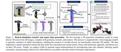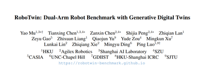 在机器人技术快速发展的背景下,双臂协调与复杂物体操作是构建先进自主系统的关键能力。然而,多样且高质量的演示数据以及贴近真实世界的评估基准的缺乏,严重制约了这一领域的发展。 为了解决这一问题,我们提出了 RoboTwin ——一个生成式数字孪生框架,利用三维生成式基础模型与大型语言模型,生成多样化的专家数据集,并提供面向双臂机器人任务、贴合真实环境的评估平台。 具体而言,RoboTwin 能够从单张二维图像创建多样化的物体数字孪生,生成逼真且可交互的场景。同时,RoboTwin 引入了一个具备空间关系感知能力的代码生成框架,该框架结合物体标注信息与大型语言模型,可拆解任务、识别空间约束,并生成精准的机器人运动控制代码。 我们的框架提供了一个全面的基准测试平台,涵盖仿真数据与真实数据,促进标准化评估,并增强仿真训练与真实部署之间的对齐程度。 我们在开源平台 COBOT Magic Robot 上验证了该方法的有效性。结果表明,基于 RoboTwin 生成数据预训练并结合少量真实样本微调后的策略,相较于仅使用真实数据训练的模型,在单臂任务中成功率提升超过 70%,在双臂任务中提升超过 40%,展现出显著的性能增强潜力,为双臂机器人操作系统的进步提供了有力支撑。