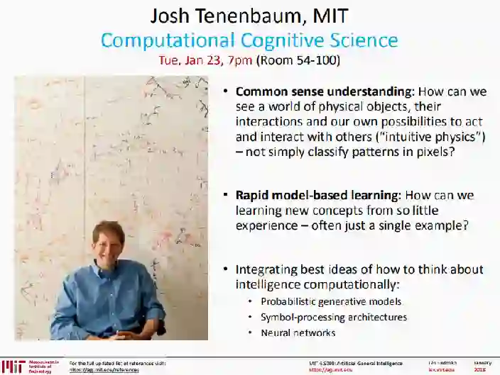 Josh Tenenbaum是麻省理工学院大脑和认知科学系教授,他的研究兴趣是人类的学习和推理,机器学习和人工智能,让机器学习算法更接近人类的学习能力,应该会产生更强大的人工智能系统,以及更强大的理论范式来理解人类的认知。目前研究探索人类认知的许多方面的计算基础:学习概念,相似性判断,推断因果连接,形成知觉表征、学习单词的含义和在自然语言语法原则,注意巧合和预测未来,推断他人的心理状态,和构造直觉理论的核心领域,如直观的物理学、心理学、生物学、或社会结构。