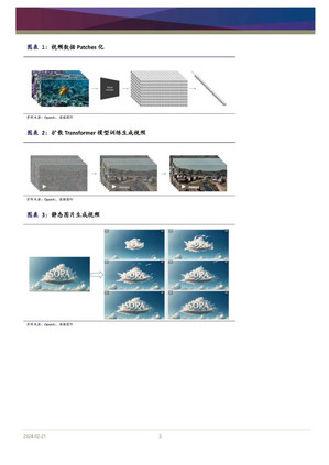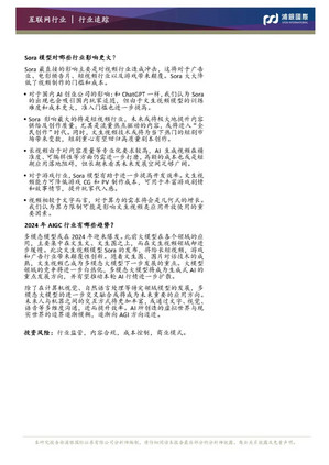 近期,OpenAI的Sora的横空出世再一次引发市场对AIGC的关注,文生视频领域取得重大突破,效果远超预期。我们将围绕Sora的核心优势、技术特点、行业影响、未来趋势等方面进行阐述。 相较于此前的文生视频模型,Sora取得哪些突破? 近期,OpenAI发布了文生视频模型Sora,可以用文字指令生成长达1分钟的高清视频。相较于此前市场上的同类模型,如Runway、Pika等,Sora的生成效果有大幅提升,远超预期: 首先,视频长度方面,Sora可以生成长达60秒的视频,长度远远大于其他AI视频模型的几秒钟长度。 其次,Sora在视频内容质量稳定性方面有大幅的提升,镜头多角度切换,视频中的主角和背景能够保持高度一致性和稳定性。 此外,Sora还展示了其对物理世界部分规律的理解,这也是一重大突破,甚至能够实现一定程度的物理交互。 Sora的核心优势和技术特点体现在哪些方面? Sora的技术优势在于“Patches”和深度语言理解。Sora是一个在不同时长、分辨率和宽高比的视频及图像上训练而成的扩散模型,同时采用了Transformer架构。Sora模型的技术优势和特点主要在于: 视觉数据Patches化:相较于大语音模型把所有的文本、符号、代码都抽象为Tokens,Sora则把视频抽象为Patches(补片),是一种具备高度扩展性且适用于视频和图片生成式模型训练的有效表示; 视频压缩网络(Video compression network):将原始视频进行压缩,从而降低视觉数据维度,用于训练并生成视频; 时空补片技术(Spacetime latent patches):给定一个压缩的输入视频,模型提取一系列时空补片(patches),用于对不同分辨率、时长和长宽比的视频和图像进行训练; 扩展Transformer视频生成:Sora是一个扩散Transformer模型,通过输入噪声patches训练来预测除噪的原始patches。OpenAI在这项研究中发现,扩散型Transformer同样能在视频模型领域中完成高效扩展; 视频多样化:相较于一些模型使用标准尺寸视频用于训练或生成,Sora能够处理不同分辨率、时长、宽高比的视频,在采样灵活性、改进框架和构图方面有显著优势; 语言理解:基于GPT模型的深度语言理解,能够更加准确地理解提示词所表达的真实需求; 图生视频、视频生视频:除了文生视频外,Sora也能够通过输入图像和视频用于生成视频,能够实现静态图片动态化、视频向前和向后拓展、视频编辑等能力。 Sora模型对哪些行业影响更大? Sora最直接的影响主要是对视频行业造成冲击,这将对于广告业、电影预告片、短视频行业以及游戏带来颠覆。Sora大大降低了视频制作的门槛和成本。 对于国内AI创业公司的影响:和ChatGPT一样,我们认为Sora的出现也会吸引国内玩家追随,但由于文生视频模型的训练难度和成本更大,准入门槛也进一步提高。 Sora影响最大的将是短视频行业,未来或将极大地提升内容供给及创作质量,尤其是流量热点驱动的内容,或将进入“全民创作”时代。同时,文生视频技术或将为当下热门的短剧市场带来变数,短剧重心有望回归高质量剧本创作。 长视频由于对内容质量等专业化要求较高,AI生成视频在精准度、可编辑性等方面仍需进一步打磨,高额的成本也或是短期应用落地阻碍,但长期来看其未来发展空间足够广阔。 对于游戏行业,Sora模型有助于进一步提高开发效率。文生视频能力可降低游戏CG和PV制作成本,可用于丰富游戏剧情和故事情节,提升玩家代入感。 视频相较于文字而言,对于算力的需求将会是几何式的增长。我们认为算力限制可能是影响文生视频类应用开放使用的重要因素。 2024年AIGC行业有哪些趋势? 多模态模型或在2024年迎来爆发。此前大模型在各个领域的应用,主要集中在文生文、文生图之上,而在文生视频领域却进步缓慢。此次文生视频模型Sora的发布,将给长短视频,游戏和广告行业带来颠覆性创新。随着文生图、图片对话技术的成熟,文生视频已成为多模态大模型下一步发展的重点。大模型领域的竞争将进一步白热化,多模态大模型将成为生成式AI的重点发展方向,并有望推动本轮AI行情进一步扩散。 除了在计算机视觉、自然语言处理等特定领域模型的发展,多模态大模型的进一步交叉融合或将成为未来重要的应用方向。未来人与机器之间的交互方式将更加丰富,或通过文字、视觉、语音等多维度沟通,进而提升效率。AI所创造的虚拟世界与现实世界的边界逐渐模糊,逐渐向AGI方向迈进。